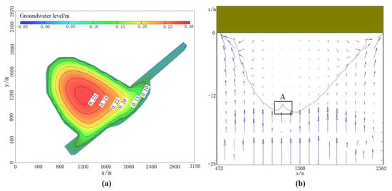 At the steady state, the water head distribution above sea level of the island and the groundwater flow rate are shown in Figure 5. It can be seen, from the Figure 5a, that the water head distribution presents the morphological characteristics of “high in the middle and low around”, forming a hydraulic gradient from the center to the periphery, which can ensure that the freshwater is continuously discharged into the sea from the thickest part of the lens body. The maximum water head, in the center of the island, can reach 0.252 m a.s.l. and the water head on the west side of the island is relatively high due to the larger recharge area. The water within the freshwater lens flows from the center of island to the sea, due to the density difference between seawater and freshwater, the seawater moves upwards to ‘lift’ the freshwater lens and float it within the island, leaving the whole groundwater system of the island in a dynamic equilibrium. The center of the freshwater lens has the lowest flow velocity, forming a stagnant zone (area A), and the closer it is to the boundary of the lens, the greater the flow velocity is. Therefore, due to the density difference between seawater and fresh water, the fresh water in the central part of the lens is more affected by buoyancy and the geometric boundary bulges upward [].
