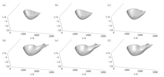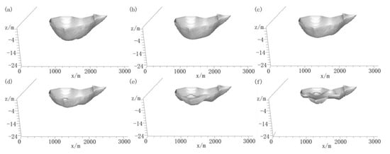 Different impermeable surface areas were set in the model and the number of occupied profile grids were 16, 36, 64, 100, 144 and 196, with areas of 0.084, 0.189, 0.336, 0.525, 0.756 and 1.029 km2, respectively, as shown in Figure 10a–f. Moreover, the model results in the steady state after reclamation of the island were used as the initial condition input model. It can be seen, from Figure 10, that the volume of the freshwater lens would gradually decrease in thickness with the increase in the impermeable surface area.
