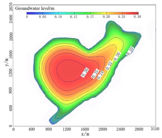 Figure 7 shows the head distribution above sea level of the island when the model becomes stable again. This suggests that, compared to the head distribution of the original island (Figure 5a), the head values after reclamation would become larger and the maximum value of the head at the center of the island would exceed 0.26 m, which is 0.01 m higher than the maximum head before island reclamation. The calculation result shows that the volume of freshwater lens would increase to 323.67 × 104 m³. The newly added fresh water would mainly come from the newly formed freshwater lens on the northeast side and the increase in the thickness of the freshwater lens on the original island would also correspondingly increase the freshwater storage. The previous research studies did not consider the reclaimed part in the numerical simulation calculation of the island, which would underestimate the calculated thickness, volume and groundwater level of the freshwater lens, so the results of this study are more consistent with the semi-natural and semi-man-made situation of the island.