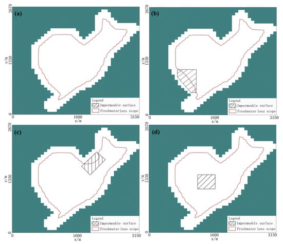 Scope of the freshwater lens in original condition (a); scope of the freshwater lens in three simulation scenarios, setting impermeable surfaces in the southwest, northeast and middle of the island (b–d).
