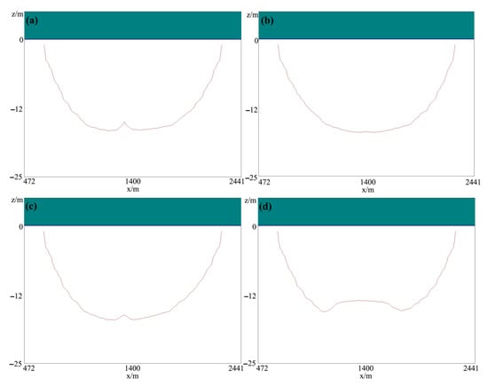 Figure 8d shows that the scope of the freshwater lens would remain almost unchanged after setting the impermeable surface in the middle of the island; therefore, row 21 of the model was selected to observe the change in the profile of the freshwater lens (Figure 9). Figure 9b,c manifest that setting impermeable surfaces on the southwest or northeast side of the island would have almost no effect on the thickness of the freshwater lens and the maximum thickness of the freshwater lens would even increase slightly. Figure 9d shows that, after setting impermeable surfaces in the center of the island, the bottom profile of the freshwater lens would bulge upwards in a trapezoidal shape, the maximum thickness would reduce to 13.7 m and the volume of the freshwater lens would reduce to 314.5 × 104 m³, a decrease of 2.8% compared to the original.
