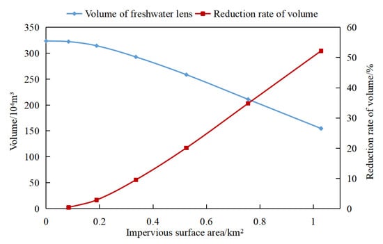 Variation in volume and volume reduction rate of the freshwater lens with the impermeable surface area.