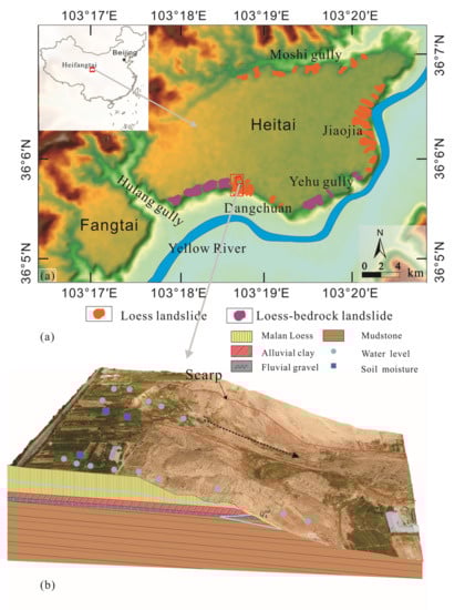 Loess, an Aeolian, non-stratified deposit, is widely distributed around the world, but concentrated in the well-known Chinese Loess Plateau, with an arid to semi-arid climate. The behavior of loesses, especially those with high water sensitivities and structures, is intimately related to frequent loess landslides [1]. Moreover, the spatiotemporal distribution of loess landslides can be altered, to a certain extent, due to anthropogenic disturbances. For instance, in response to irrigation activities, about 200 landslides and 40 casualties have occurred in the Heifangtai (HFT) area since the 1970s [2,3,4]. What is worse is the high-density landslide-developing zone of landslides, about 10 km along the edge of the loess tableland, where subsequent landslides often follow previous landslides [5,6,7,8,9]. Such landslide-on-landslide effects are widespread in loess areas and often pose a serious threat to large-scale casualties and property losses. Moreover, with the rapid development of urbanization and the economy in the Loess Plateau, human activities will contribute to more cases of the landslide-prone landscape, which leads to successive landslides.