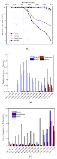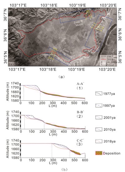 Figure 2a shows the results of the degradation distance performed on tableland edge from 1967 to 2018. Numerous landslides occurred on the northeast, southeast, and southwest edges of the Heitai tableland, which finally developed into three concentrated landslide clusters (Dangchuan, Jiaojia, and Moshi) (Figure 2a). The change in tableland edge from 1967 to 2018 was associated with irrigation-induced loess landslides. The three typical tableland boundary sections marked by blue lines are shown in Figure 2b.