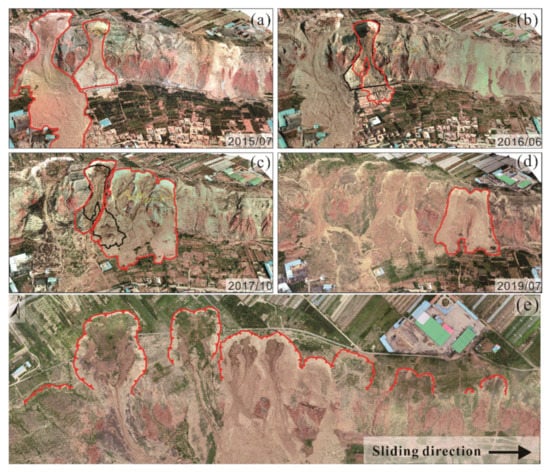 Nearly all successive landslides occurred in the Dangchuan area in recent years; thus, the current study in this article mainly focused on the Dangchuan landslide cluster. Over the past five years, more than twenty landslides have been recorded along a one-kilometer-long edge of the tableland. The landslide morphology in Dangchuan from 2015 to 2019 is shown in Figure 4.