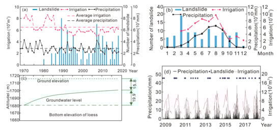 Statistical charts of precipitation, irrigation, groundwater level, and landslide; (a,c) charts of interannual variety from 1968 to 2018; (b) chart of inter-monthly variation; (d) diagram chart of precipitation, irrigation, and landslide from 2009 to 2018.