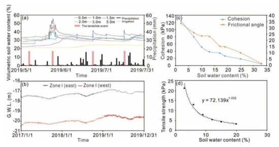 The rainfall and irrigation could also change the physical and mechanical properties of loess. According to our tests, the shear strength of samples with 6% soil moisture was twice as much as those with 30% soil moisture (Figure 6c). With the increase of soil moisture, the tensile strength decreased exponentially (Figure 6d). The tensile strength of the loess is about 15% of its cohesion. The results of unsaturated soil tests show that the cohesion increased linearly with the increase of matric suction, but the effective internal friction angle was constant [51,52]. This shows that irrigation could reduce loess strength by increasing the soil moisture of slope. The peak value and residual shear strength of loess can be significantly reduced by lithification with irrigation water [53,54]. Therefore, irrigation water played a crucial role in reducing the shear strength of the slide surface.