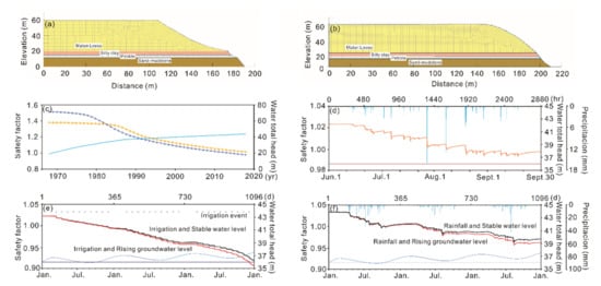 Unsaturated seepage stability analysis was used to analyze the effect of different factors on the formation of the landslide. The methods of unsteady flow and unsaturated stability were adopted in the numerical analysis via using GeoStudio, a professional geotechnical software. The material parameters and analysis process were the same as in our previous papers [45,55,56]. Two cross-sections in Dangchuan and one cross-section in Jiaojia were selected to establish the models (Figure 7a,b). The influence of the rise of the groundwater level on the stability was simulated by setting a time-varying groundwater level boundary on the left side of the models. The analysis results of model 2 (Figure 7c) show that the stability was 1.51 in 1967 and decreased to 0.98 in 2018. The initial stability of model 1 was 0.14 lower than that of model 2. However, it surpassed the latter by 0.05 after 51 years later. The stability of the concave slope decreased faster than that of a convex slope, owing to different geometry and seepage field of the slope. Previous studies [55] have also shown that slope stability decreased by 0.1 as groundwater level rose by 5 m. The influence of rainfall on slope stability was simulated by setting rainfall boundary (Figure 7d,f) in the upper part of model 1. Figure 7f shows the change of slope stability during the rainy season (June–August). The results show that rainfall could reduce the stability of the slope slightly, and it had a lag effect. Figure 7f shows that, with the arrival of the rainy season, the slope stability decreased, reaching the lowest level in late August. Moreover, it slightly increased as the rainy season came to its end. Although rainfall had a small impact on the slope safety factor, most slopes had become unstable, as the groundwater level had risen by more than 20 m. The landslide could be triggered by a rainstorm or persistent rain. Due to the lack of irrigation records at the slope where the model was located, we simplified the irrigation to once a month from March to December (Figure 7e). The calculation results show that flood irrigation could cause slope instability (Figure 7e). The effect of flood irrigation on slope stability was higher than that of rainfall. The influence of rainfall and irrigation on slope stability was greater than that of the periodic change of groundwater level (Figure 7f,e). The periodic change of the groundwater level is mainly caused by rainfall and irrigation, which has a long lag process. Gu et al. [45] analyzed the effect of different irrigation locations on slope stability. The results show that when the distance between flood irrigation and the edge of the tableland was less than 60 m, the influence of irrigation on slope stability became greater, and the stability of the slope decreased, almost in a straight line. When the distance was less than 25 m, the stability of the slope decreased from 1.10 to 0.98 within three years. It reveals that the closer the irrigation location was to the edge of the tableland, the more likely the irrigation would affect the soil near the potential sliding surface. The above analysis demonstrated that irrigation or rainfall had a triggering effect on the landslide and had a long time lag. The decline of shear strength of loess caused by loess desalination could also reduce slope stability. However, leaching is a slow process (desalination rate < 50% in more than 40 years), which is one of the reasons for the lagged occurrence of the loess landslides [57].