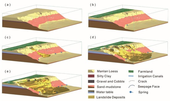 The evolutionary process of landslides induced by irrigation began with local failure and developed to a single sliding. A large number of single slidings were superimposed to form a group of landslides, which caused the tableland surface to retreat. Based on data analysis reported above and field observations, we identified the following five stages of landslide evolution in the study area: