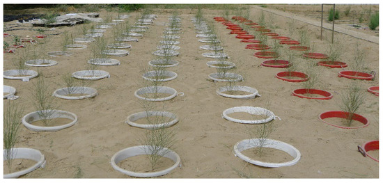 - Li, C.; Shi, X.; Mohamad, O.A.; Gao, J.; Xu, X.; Xie, Y. Moderate irrigation intervals facilitate establishment of two desert shrubs in the Taklimakan Desert Highway Shelterbelt in China. PLoS ONE 2017, 12, e0180875. [Google Scholar] [CrossRef]