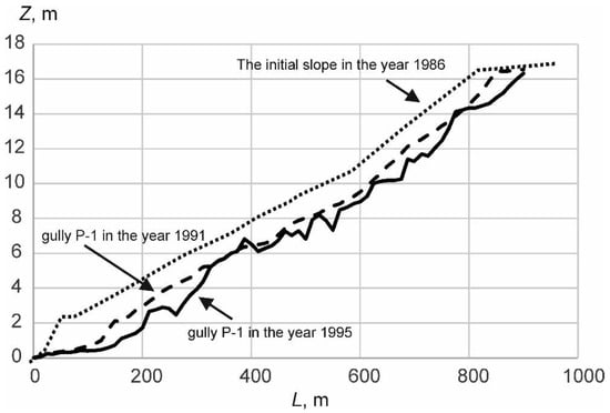 The common definition of validation offered by the Society for Computer Simulation Technical Committee on Model Credibility [28] is “Substantiation that a computerized model within its domain of applicability possesses a satisfactory range of accuracy consistent with the intended application of the model”. In our case, “a satisfactory range of accuracy” depends on the quality of the measurements on the natural object and on the accuracy of the input data necessary for calculations. The catchment selected for the validation and calibration procedure (Figure 1) is situated on the Yamal Peninsula, West Siberia, close to the most severely gullied part of the peninsula. The investigated gully P-1 did not exist in 1986. After construction in 1986–1987 of the exploitation camp at the top of the catchment, erosion and thermoerosion began due to the increased water supply and vegetation cover damage. In 1988, the gully P-1 length was 450 m, in 1989—740 m, in 1990–1991—940 m and in 1995—965 m. The gully head reached the buildings of the exploitation camp, and repeated filling of the gully head with heavy loam by bulldozers stopped the gully growth. The observations showed that gully P-1 was still active in 2007 [18] and further (Figure 1), increased in depth and volume, though the gully length did not increase further. Therefore, the period 1991–1995 of not regulated gully activity was used for model validation and calibration with two longitudinal profiles of the gully bed measured in July 1991 and 1995 (Figure 2).