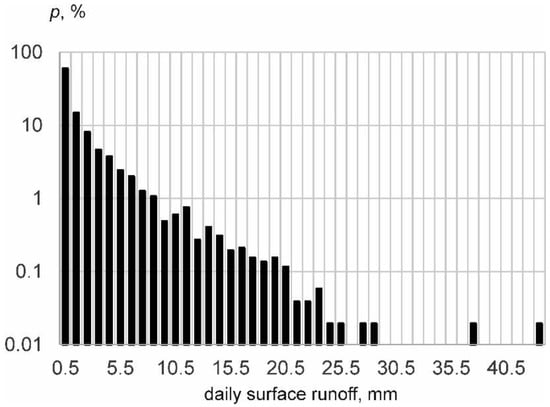 Histogram of daily surface runoff at the gully P-1 catchment.