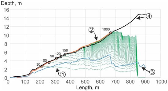 The sequence of gully P-1 incision depths calculated with GULTEM for the 1200-year period with 30-year step (green lines 1; pentagrams on some of the lines indicate the age). Red line 2 shows the depths of the gully after 1000 calculation years. Blue line 3 shows the depths of the most probable stable gully, black line 4—the depths of the ultimate stable gully, calculated with the STABGUL model.