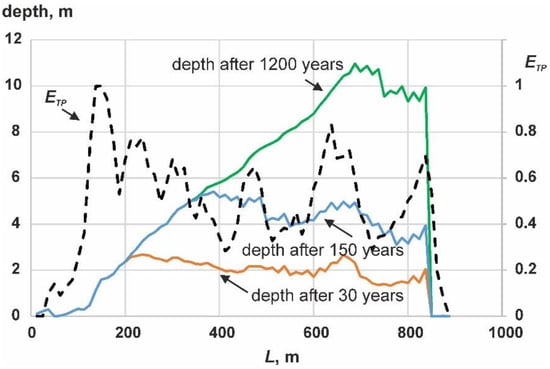 The total erosion potential was calculated in the TEP model along the same flowline and with the same empirical coefficients and hydrological data as gully depth in GULTEM. The similarities and differences in the results (Figure 6) are explained by the similarities and differences in the models’ formulations. Both models operate with the rate of erosion E (Equation (4)), which depends on local slope inclination and specific discharge.