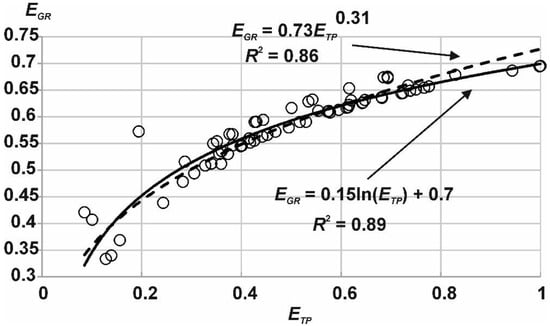 As in Equation (31), the value of EGR varies from 1 (at Mcr = 0) to 0 (at Mcr ≥ Mmax), which corresponds to a change in the degree of potential erosion risk. At Mcr = 0, erosion begins at a given point for any, the smallest values of the runoff depth and EGR is maximum. Accordingly, at Mcr ≥ Mmax, the runoff depth does not exceed the critical depth, and erosion will not occur at this point.