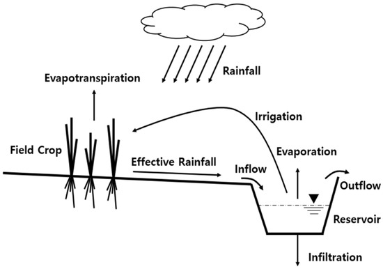 The mool-tong is the name of the small agricultural reservoir used on Jeju Island, Korea. Mool-tongs are generally located where the rainwater collection is rather easier. It is simply because most mool-tongs were made by the residents in Udo by their labor. The collected rainwater is mainly used for agriculture. Mool-tongs are still used for agriculture, even though the domestic water is supplied by waterworks from Jeju Island [29]. To estimate the amount of irrigation water from a mool-tong, it is necessary to simulate the water storage within the mool-tong. This study considered a simple water balance model for that purpose. The water balance model was applied to 24 mool-tongs, whose simulation results were used to evaluate the agricultural water deficit of four popular crops on Udo. The water stored in a mool-tong increases in proportion to the inflow from the corresponding sub-basin that the mool-tong represents. On the other hand, the water stored in a mool-tong decreases when irrigation from the mool-tong begins. The inflow into a mool-tong is simply the direct runoff from the corresponding sub-basin, i.e., the effective rainfall estimated by subtracting the infiltration and interception from the rainfall. The direct loss from a mool-tong includes irrigation water, evaporation loss from the surface, and infiltration from the bottom of the mool-tong. Additionally, if the mool-tong is full, additional inflows into the mool-tong are assumed to be a loss. Figure 1 shows the water balance model for the mool-tong used in this study: