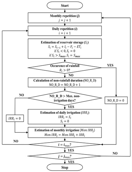 The amount of irrigation water was calculated on a daily basis by considering the current water storage in the mool-tong and the number of consecutive rainless days (Figure 2). The current water storage in the mool-tong was calculated by Equation (2). Then, it was determined if the current water storage should be used for irrigation or not. This study introduced a condition for this purpose that irrigation should occur whenever the number of consecutive rainless days was longer than the maximum non-irrigation days. Here the maximum non-irrigation days means the maximum number of days that a crop does not wither without any water supply. KRRI (2002) observed that the maximum non-irrigation days for bean and potato on Jeju Island are both around 10 days. It is also the same for spring onion and garlic [38].