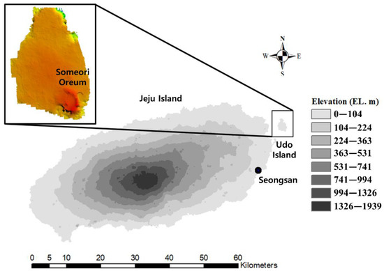 Udo is a small island located near the eastern part of Jeju Island. The area of Udo is just 6.1 km2, and its southeastern part is located on a small hill named the Someori Oreum. The Someori Oreum is made of pyroclastic deposits, and its height is 132.5 m. A small crater with a diameter of about 600 m and depth of about 40 m can also be found at the center of the Someori Oreum, which is open to the northwestern direction. The remaining area is the lava shield, which is mostly flat, with a height of less than 30 m. Figure 3 shows the location of Udo and its topographic characteristics. The meteorological data from Seongsan weather station were used in this study to represent the weather on Udo.