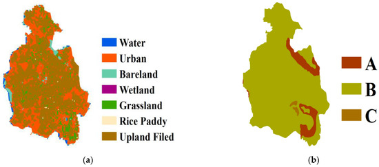 Figure 4a shows the information on land use, and Figure 4b shows the hydrological soil group over Udo. The digital soil map and the digital land use map can be obtained from the National Spatial Infrastructure Portal (http://data.nsdi.go.kr/ (accessed on 13 March 2021)) and Environmental Geographic Information Service (https://egis.me.go.kr/ (accessed on 13 March 2021)), respectively. Figure 4a shows that most of the area of Udo is used for farm fields (64.9%, 3.86 km2), while the remaining part is for forest (15.3%, 0.95 km2), roads (8.0%, 0.49 km2), etc. The hydrological soil group B is dominant on Udo (90.6%), as shown in Figure 4b. The hydrological soil group A covers 8.7%, while the hydrological soil group C covers just 0.7%. The representative crops on Udo include garlic, spring onion, peanut, and barley. In 2018, the farming area of garlic covered about 12.9%, spring onion about 21.0%, peanut about 40.2%, and barley about 25.9% [39]. Recently, the farming area planted in peanut on Udo has increased significantly.