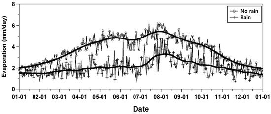 The pan evaporation data are also available at the Seongsan weather station, but only from 1977 to 1990. Measurement was discontinued from 1991. As it was not possible to use the actual evaporation measurement for simulation of the water storage in the mool-tongs, in this study the representative evaporation data were derived on a daily basis by considering the year-round variation in evaporation and its dependence on the rainfall occurrence. As is well known, evaporation varies significantly by season, and is also very dependent upon the rainfall occurrence. The rainfall amount and rainfall duration also affect the evaporation, but to simplify the simulation, were not considered in this study. Finally, Figure 7 shows the two curves that represent the year-round variation in evaporation under rain and no-rain conditions that were derived. In this figure, the two wiggly curves are those derived by averaging the available daily measurements of evaporation under the rain and no-rain conditions, respectively, while the solid lines are their smoothed versions. This study used the smoothed lines to determine the daily evaporation from the mool-tongs. That is, for the given date, evaporation from a mool-tong was determined simply by considering the rainfall occurrence condition.