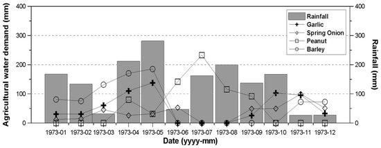 The consumptive use of water, or the agricultural water demand, was estimated by applying the Blaney-Criddle method for the four crops on Udo—garlic, spring onion, peanut, and barley. The agricultural water demand was estimated on a monthly basis. As an example, Figure 8 compares the monthly rainfall and agricultural water demand for the year 1973. The agricultural water demand for garlic was concentrated in the spring and fall seasons. The agricultural water demand for spring onion was also concentrated in the spring and fall seasons, but the total amount of water demand was estimated to be a bit less than that for garlic. On the other hand, the agricultural water demand for barley was found to be concentrated in the winter and spring seasons. As the growing period of peanut includes the summer season, its agricultural water demand was also estimated to be high in summer.