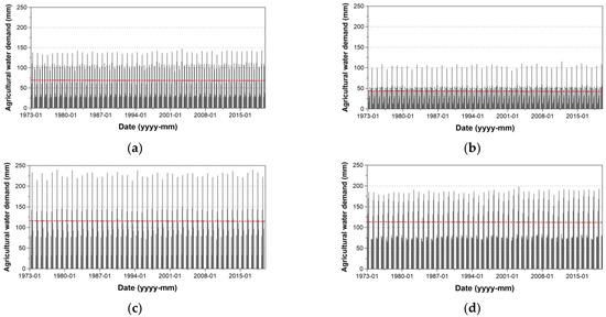 This study estimated the agricultural water demand of the four crops of interest in this study from 1973 to 2019. Figure 9 compares the temporal variation of agricultural water demand for those four crops, which shows obviously different patterns depending on the crop. The red horizontal line in Figure 9 represents the mean value of agricultural water demand for each crop. Both the crop coefficient and growing period affected the simulation result. Simply put, the agricultural water demand was high during the growing period, and low outside the growing period. The crop coefficient also varies depending on the growth stage of a crop. On average, the agricultural water demand of peanut was estimated to be about 115.0 mm/month, while that of barley was about 112.4 mm/month. Rather smaller estimates were derived for garlic and spring onion, which were 70.5 and 44.2 mm/month, respectively. The highest value was recorded for peanut, and the smallest for spring onion. As the growing period of peanut included the hot summer, the agricultural water demand was also estimated to be high. In general, the agricultural water demand was proportional to the temperature and sunshine duration.