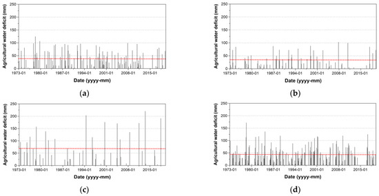 Agricultural water deficit indicates the shortage of monthly rainfall to meet the agricultural water demand. Thus, in the case where monthly rainfall is larger than agricultural water demand, the agricultural water deficit becomes zero. For example, in Figure 8, the rainfall amount in July was found to be smaller than the agricultural water demand, and their difference became the agricultural water deficit. Figure 10 shows the temporal variation in agricultural water deficit calculated from 1973 to 2019 for the four crops considered in this study. The red horizontal line in Figure 10 represents the mean value of the agricultural water deficit for each crop. Occurrence of agricultural water deficit was found to be most frequent for barley, and least frequent for peanut. However, whenever the agricultural deficit for peanut occurred, the amount of agricultural water deficit was larger than for the other three crops, indicating the highest deficit severity.