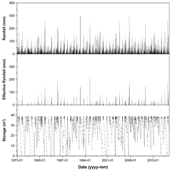 Second, the SCS–CN method was then applied to estimate the effective rainfall for each sub-basin. This effective rainfall was used as the inflow to the corresponding mool-tong. The simple water balance model was then applied to estimate the water storage in the mool-tong. Figure 11 shows the rainfall, effective rainfall, and water storage in mool-tong #1. Basically, due to the large amount of infiltration, slightly smaller effective rainfall was estimated. By considering both the evaporation loss from the surface of the mool-tong and the infiltration loss from the bottom of the mool-tong, the water storage in the mool-tong could be estimated. The maximum value of the water storage in mool-tong #1 was found to be just 38.9 m3, as shown in Figure 11, which was, in fact, the maximum storage capacity of mool-tong #1.