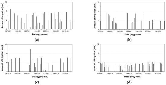 In this study, the maximum non-irrigation days were set to 10 days, which might be the representative value for those crops considered in this study. That is, only when the number of consecutive rainless days was longer than 10 days was irrigation set to occur. Additionally, whenever irrigation occurred, all the stored water in the mool-tong was assumed to be used. This is because in comparison with the size of the farm field, the size of the mool-tong is rather small. In the case of rain on the day that irrigation should occur, the irrigation was set to stop. This simulation was performed on a daily basis, and the monthly irrigation amount was calculated by accumulating the daily irrigation amount.