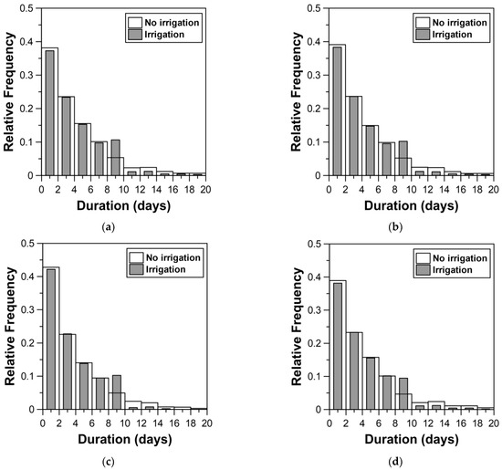 Finally, this study compared the irrigation interval before and after introducing the mool-tongs. The irrigation interval has a special meaning, as it is a crucial factor determining the survival of a crop. Without the mool-tongs, the irrigation interval is simply the interval between two consecutive rainfall events. But if considering the mool-tongs, the irrigation interval should be estimated by additionally considering the irrigation from the mool-tongs. Figure 13 compares the histograms of irrigation intervals before and after introducing the irrigation from the mool-tongs, and Table 8 summarizes the exceedance probability of 10 days, which was assumed as the maximum number of non-irrigation days to keep those four crops on Udo from withering [38]. The exceedance probability was estimated by dividing the number of irrigation intervals longer than 10 days by the total irrigation intervals. As the frequency of the irrigation intervals longer than the maximum non-irrigation days directly affects crop production, the exceedance probability in Table 8 indicates how the crop production could be increased by introducing the mool-tongs.