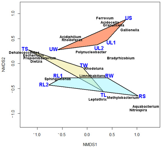NMDS ordination biplot for microbial communities from 3 types of habitats at 3 sites along an AMD gradient. Stress = 0.10. Only the most abundant genera are shown. Community codes: U = untreated site; T = treated site; R = reference site; W = water habitat; L = leaf habitat; S = sediment habitat; 1 and 2 indicate replicate samples. Communities from the 3 habitats are connected for each respective site.