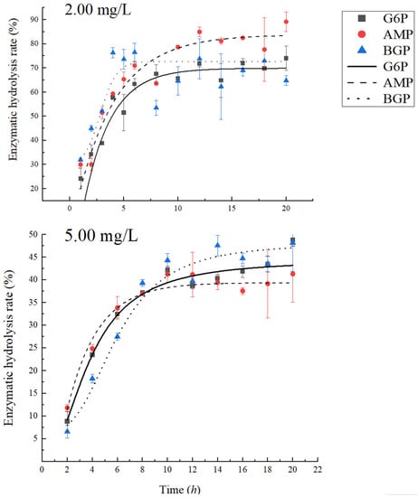 With excess enzymes, when the initial concentration of total phosphorus was 2.00 mg/L and 5.00 mg/L, the enzymatic hydrolysis rate of each phosphate monoester showed a similar trend over time. With the extension of reaction time, the enzymatic hydrolysis rate first increased and then tended to be stable (Figure 2). When the initial phosphorus concentration was 2.00 mg/L, G6P and AMP reached the maximal enzymatic hydrolysis rate at 12 h, while BGP reached the maximal enzymatic hydrolysis rate at 6 h. When the initial phosphorus concentration was 5.00 mg/L, all three phosphate monoesters reached their maximal enzymatic hydrolysis rates at 12 h. In addition, it is clear that the maximal enzymatic hydrolysis rate of phosphate monoester at a high initial phosphorus concentration (48.47%) was lower than that at a low initial phosphorus concentration (85.80%).