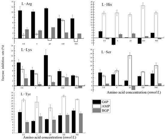 Three phosphate monoesters, G6P, BGP, and AMP, were chosen as organic phosphorus substrates to study the influence of L-His, L-Arg, L-Lys, L-Ser, and L-Tyr on PhoA mineralization of organic phosphorus. Amino acid solutions with concentrations of 1.60, 8.00, 40.00, 200.00, and 1000.00 nmol/L were prepared, and pH was set to 8.00. Solutions with the concentration of 4.00 mg/L were prepared for G6P, BGP, and AMP, and pH was set to 8.00 as well. In the experimental group, the organic phosphorus solution and the amino acid solution were mixed at the ratio of 1:1 (v/v); then, PhoA with the concentration of 0.44 U/mL was added. In the control group, the organic phosphorus solution and high-purity water were mixed at the ratio of 1:1 (v/v); other conditions were the same as those of the experimental group. Both the experimental and the control groups oscillated in the dark at the constant temperature of 25 °C for 12 h. The experiments were conducted in triplicates for each group. The molybdenum antimony anti-spectrophotometry method [] was used to determine orthophosphate to find out the impact of different concentrations of soluble amino acids on PhoA mineralization of three organophosphate monoesters.