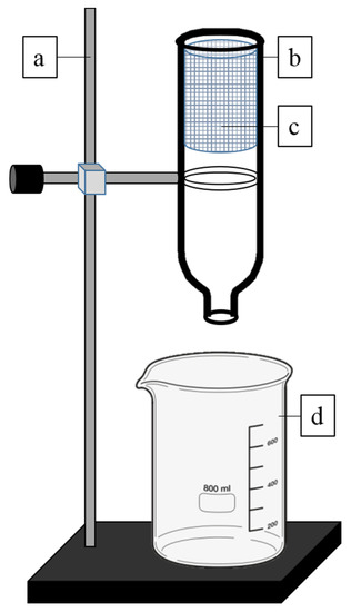 Experimental setup for the filter system: (a) retort stand; (b) plastic bottle; (c) cylinder holder; (d) beaker.