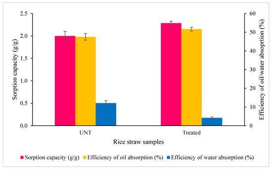 The effect of temperature pre-treatment of RS on the sorption capacity and the efficiency of oil/water absorption. Error bars represent the mean ± SEM of three replicates.