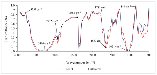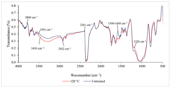 ATR-IR spectra of untreated and pre-treated (120 °C) RS after wetting with oil–seawater mixture.