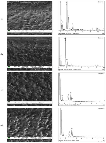 Images from scanning electron microscopy (SEM, left) and outputs of EDX (right): (a) untreated rice straw before wetting with oil–seawater mixture; (b) untreated rice straw after wetting with oil–seawater mixture; (c) pre-treated rice straw before wetting with oil–seawater mixture; (d) pre-treated rice straw after wetting with oil–seawater mixture.