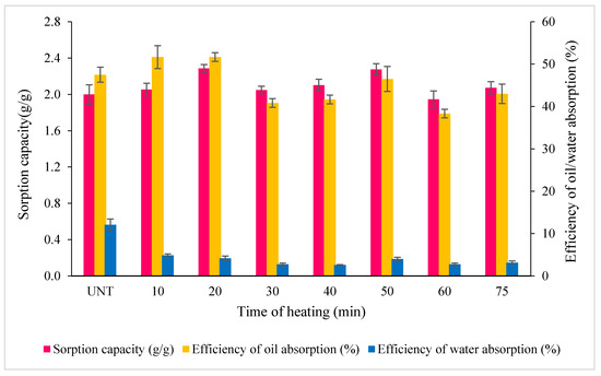 The effect of time of heating on the sorption capacity and the efficiency of oil/water absorption by RS pre-treated at 120 °C. Error bars represent the mean ± SEM of three replicates.