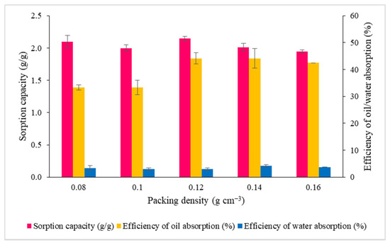 The effect of packing density on the sorption capacity and efficiency of oil/water absorption of RS pre-treated at 120 °C for 20 min. Error bars represent the mean ± SEM of three replicates.
