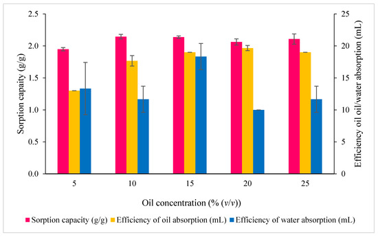 The influence of oil concentration on the sorption capacity and the efficiency of oil/water absorption by RS heat treated at 120 °C for 20 min and at the selected packing density. Error bars represent the mean ± SEM of three replicates.