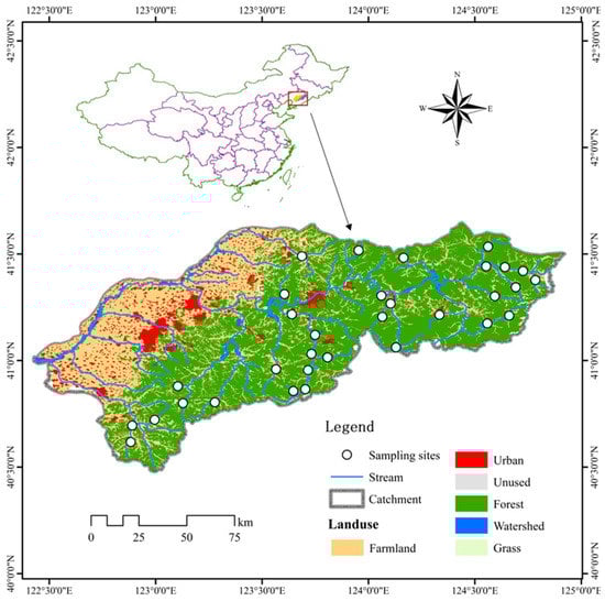 The Taizi River basin is located in northeastern China (122°26′–124°53′ E, 40°29′–41°39′ N) with a catchment area of 1.39 × 104 km2. The Taizi River is a typical temperate river with a total length of 413 km. The annual average precipitation is 778.1 mm, that is unevenly distributed, mostly throughout the flood season from June to September. The multiyear average temperature is 6.2 °C with a huge temperature difference between winter and summer. In addition, the obvious environmental interference gradient in the basin is the key reason for selecting this study area []. The geomorphological features of the basin include the upper middle mountainous and hilly forest region and the lower plain agricultural region. The mountain region has a high percentage of natural vegetation cover with little human disturbance, whereas the plain region is mainly agricultural and urban land. The anthropogenic activities gradually increase from upstream to downstream.