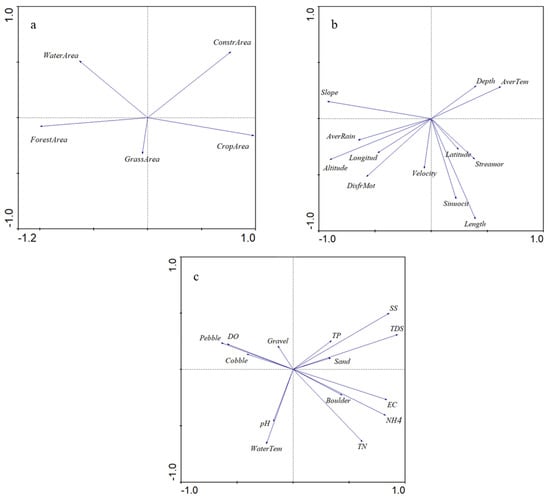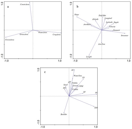 PCA ordination diagram of environmental variables in plain rivers: (a) catchment scale; (b) reach scale; (c) site scale.