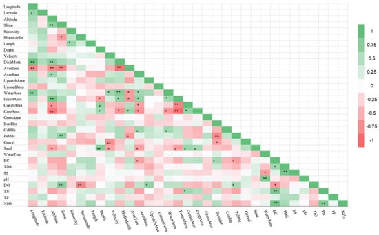 Heatmap of correlation coefficients among environmental variables in plain rivers. Significant correlations are marked with p-values (* p < 0.05, ** p < 0.01).