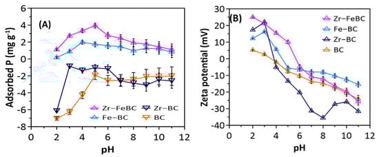 The pH is a significant and primary parameter during adsorption. In this study, results indicated that P sorption efficiency increases with increasing pH up to 5. Maximum adsorption for Zr–FeBC and Fe–BC was observed at pH 5 and 4, respectively. The P removal efficiency decreased almost 3-fold (from 3.94 to 1.11 mg g−1 (93% to 30.13%) and 1.97 to 0.82 mg g−1 (78.47% to 28.52%)) when pH values increased from 5 to 11 and 4 to 11 for Zr–FeBC and Fe–BC, respectively (Figure 1A). This can be explained by the pKa value of phosphate. The phosphate species mainly exists as PO43–, HPO42– and H2PO4– (pKa values of 12.3, 7.2 and 2.1) in aqueous solution []. The common phosphate ions mostly exist as H2PO4– at pH 4–6, that are comparatively more adsorbed than HPO42– or PO43– at pH > 6 [,]. High pH can lead to electrostatic repulsion between negatively charged phosphate ions and Zr–OH/Fe–O groups, which results in a declined trend of P adsorption since deprotonation occurs at the biochars surface at higher pH [,]. The higher P adsorption capacity of thermally treated alum sludge has been reported at pH 4–6 [], which is supported in this study.