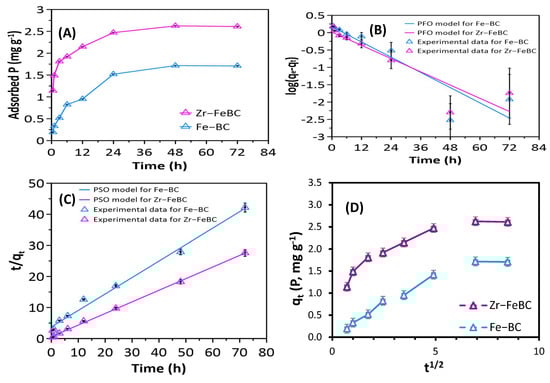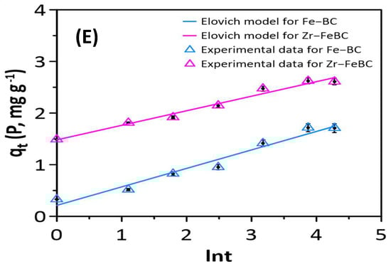 To understand the P removal mechanisms and to evaluate the practical applicability of biochars, the investigation of kinetics is fundamental, as kinetic models offer valuable insights into the mechanisms of adsorption procedure. In this study, the amount of P removal increased with time and reached close to the equilibrium state within 24 h (Figure 2A). To probe the rate-controlling step of kinetic reaction by Zr–FeBC and Fe–BC, the pseudo-first order, pseudo-second order, intraparticle diffusion and Elovich model (Figure 2B–E) were utilized; kinetic model parameters are listed in Table 2. Results revealed that the kinetics data best fitted with the pseudo-second order model (R2 = 0.99) (Figure 2C) followed by the Elovich model (R2 = 0.96–0.98) (Table 2).