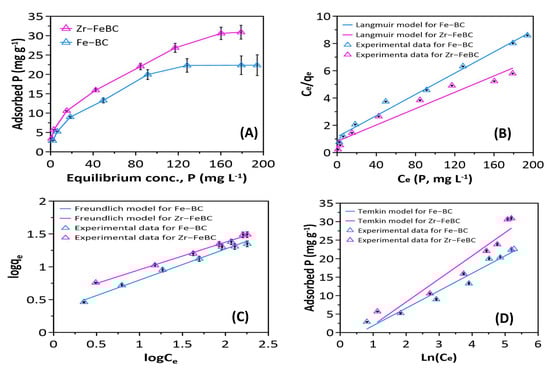 The P adsorption increased rapidly with increasing initial P concentration up to 20 mg L−1 at the equilibrium and then increased gradually (Figure 3A). Hence, the Langmuir, Freundlich and Temkin isotherm models were applied to fit for calculating the maximum P adsorption capacity by biochars as well as adsorbents sorption process (surface phenomenon whether homogeneous or heterogeneous). The isotherm model parameters were listed in the Table 3 and Figure 3. In general, the Langmuir model described a monolayer adsorption process applied onto a uniform surface, while the Freundlich model is applied for heterogeneous distribution with multiple layers of adsorption [,]. In the current study, the calculated coefficient of determination (R2) by Langmuir, Freundlich and Temkin models were 0.95 and 0.99, 0.99 and 0.99, and 0.92 and 0.96 for Zr–FeBC and Fe–BC, respectively. Therefore, the experimental data were best described with the Freundlich model (R2 = 0.99 for both biochars), which demonstrated the adsorption of P occurred via multilayer and heterogeneous surfaces of the biochars. The maximum P adsorption capacities were achieved to 33.33 and 25.71 mg g−1 by Zr–FeBC and Fe–BC, respectively by the Langmuir isotherm model. The Freundlich constant KF value of Zr–FeBC (3.45) was higher than Fe–BC (2.17). The biochar surface heterogeneity or adsorption intensity (1/n) for both Zr–FeBC and Fe–BC were less than unity, which indicated P adsorption is controlled by a chemisorption process [].