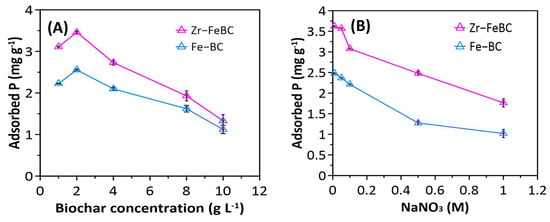 The effect of biochar concentration on P removal was examined with a range of doses from 1–10 g L−1 at pH 4 and 5 for Fe–BC and Zr–FeBC, respectively. Results showed that P adsorption capacity increased from 3.11 to 3.46 mg g−1 (11.2%) and 2.23 to 2.55 mg g−1 (14.3%) for Fe–BC and Zr–FeBC, respectively, when biochar concentration increases from 1 to 2 g L−1 (Figure 4A). The maximum adsorption capacity of both Fe–BC and Zr–FeBC reached at biochar concentration of 2 g L−1, which described that the biochar surface is fully saturated with the P molecules at this biochar concentration []. The enhanced P removal capacity could be attributed to the increased biochar surface area available, which provides more active adsorption sites for adsorption of the P [,]. However, the P adsorption capacity decreased to 61.6% (3.46–1.33 mg g−1) and 56.1% (2.55–1.12 mg g−1) with an increase in the biochar concentration from 2 to 10 g L−1 for Fe–BC and Zr–FeBC, respectively using the same P concentration (20 mg L−1) (Figure 4A). A decreasing trend of P removal efficiency may be associated with the unsaturated active sites on the biochar surface []. Therefore, the excess amount of biochar was not significant for the contribution of P adsorption from solution when all P was adsorbed by biochar surface. Thus the P adsorption was correlated negatively with biochar concentration, which is also wasteful [].