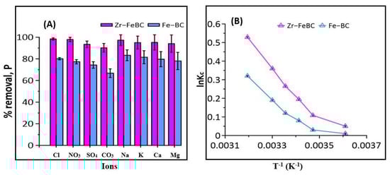Sorption selectivity is a significant factor for the investigation of the influence of P removal effectiveness. Surface or wastewater generally contains common naturally occurring anions (Cl–, NO3–, SO42– and CO32–) and cations (Na+, K+, Ca2+ and Mg2+), which may compete with P-sorption sites and significantly influence the P-sorption efficiencies. In this study, there was a limited decrease in P-sorption capacity of biochars induced by Cl–, NO3– and SO42–. However, P-removal declined from 80 to 66.77% and 98.43 to 90.23% when reacted to CO32– by Zr–FeBC and Fe–BC, respectively (Figure 5A). This inhibition could be due to the strong competition between PO43– and CO32– for adsorption sites on biochars surfaces. In addition, the competition between PO43– and CO32– was found to be more prominent using Zr–FeBC compared to Fe–BC biochar, which could be influenced by the Fe or Fe/Zr ratios. The literature has shown that there was negligible interference from common ions such as Cl−, NO3−, SO42−, HCO3−, Ca2+ and Mg2+ with concentrations up to 100 mg/L, indicating the strong selectivity of the La(OH)3/Fe3O4 material []. Another study showed that no significant decline in phosphate removal (initial phosphate concentration was 10 mg L−1) to Cl−, NO3−, SO42− and HCO3− anions using La-modified bio-ceramisite []. Other adsorbents, such as La(OH)3 nano composites, La-loaded mesoporous nanospheres and La(OH)3 modified BC, showed excellent selectivity facilities on the recovery of phosphate results [,,]. Among the analyzed common coexisting ions (NO3−, CO32−, Cl−, SO42−), only SO42− considerably affected the P adsorption, reducing the removal capacity in 7.3% for smaller nanoparticles and 12.4% for larger nanoparticles of CoFe2O4γ-Fe2O3 []. The La-based Fe-oxide nanosheets showed high selectivity for phosphate removal with less than 10% reduction in phosphate in the presence of NO3−, HCO32−, Cl−, SO42− and humic acids []. However, similar anionic effects on P removal were reported using zeolite/steel slag/fly ash/basalt composite fiber []. No inhibitory impact of NO3−, Cl− and SO42− was observed on P removal using graphite modified magnesium oxide nanoparticles []. No significant inhibition or enhancement of P-removal was noticed when reaction with common cations, including Na+, K+, Ca2+ and Mg2+, in the current study (Figure 5A).