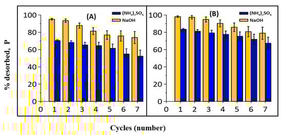 To investigate the reusability and release of P from biochars, seven adsorption–desorption cycles were performed utilizing desorbing agents such as 0.05 M ammonium sulfate [(NH4)2SO4], and 0.1 M NaOH (biochar density was 2 g L−1 and initial P concentration was 20 mg L−1) after washing and oven drying followed by continuous shaking for 24 h at 22 ± 0.5 °C. To check the reproducibility of biochars, each experiment was carried out under identical conditions. The desorbed P was tested by ICP-OES and the desorption efficiency of adsorbent was calculated employing the following Equation (7) [,]: