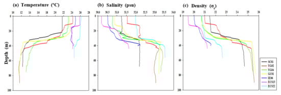 Vertical profiles of (a) temperature, (b) salinity, and (c) density at all the experimental stations of the YS and ECS for late summer of 2020.